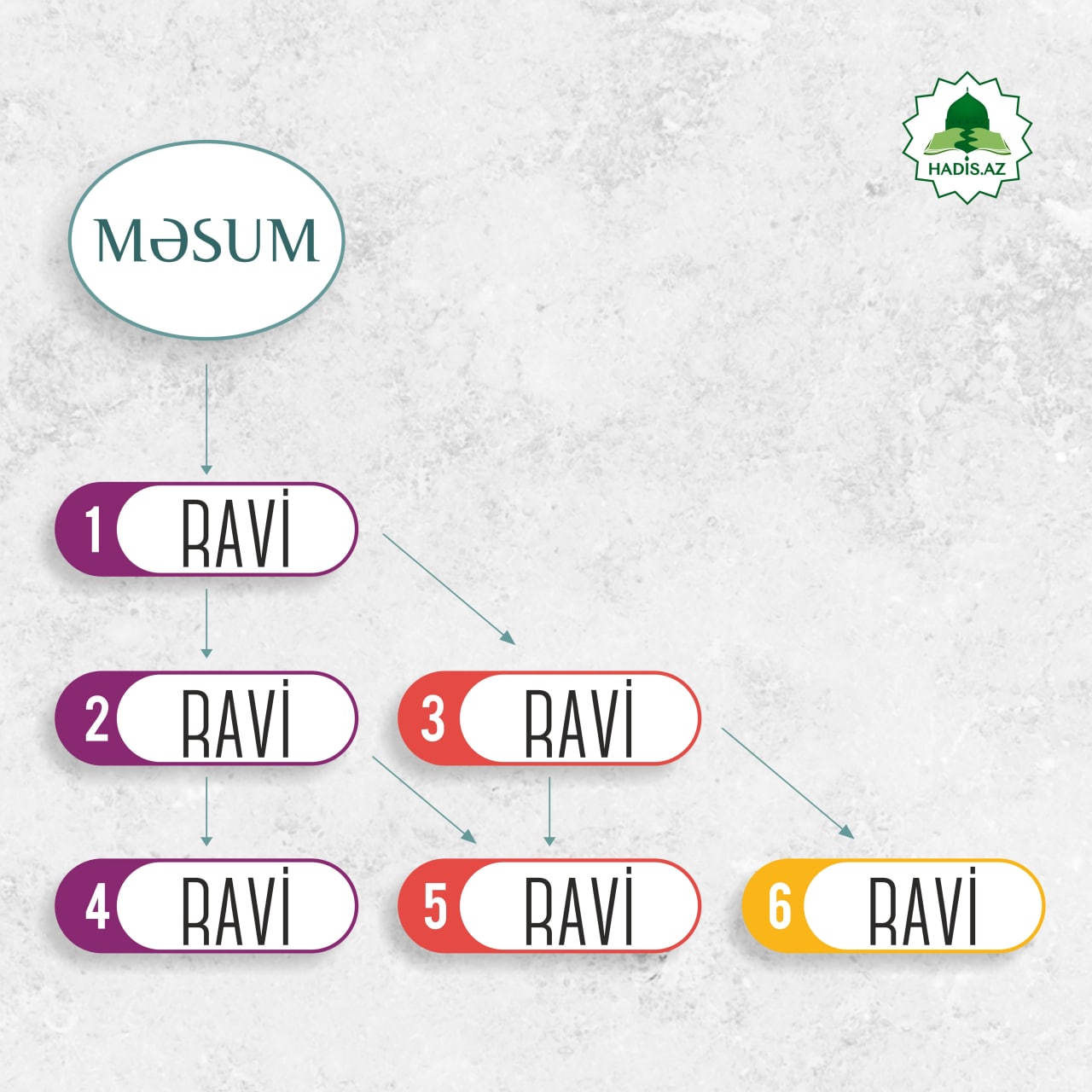 Şəkildə göründüyü kimi, fərz etdiyimiz hədisin 3 təbəqəsi var və hər təbəqədə yalnız bir ravi var. Bir hədisin bu cür sənəddən başqa bir sənədi olmazsa, o hədis mütləq qərib adlanar.